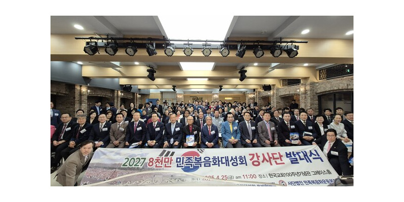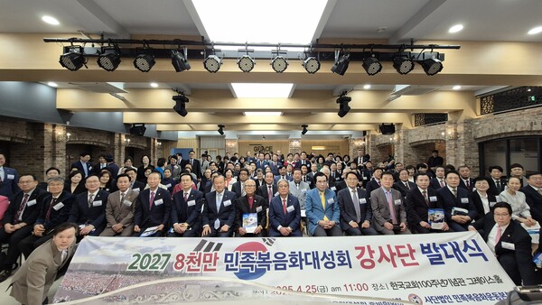 민족복음화운동본부(총재 이태희 목사)는 25일 서울 종로구 한국교회100주년기념관에서 '2027 8천만 민족복음화대성회 강사단 발대식'을 열고, 전국 복음화 운동의 시작을 알렸다.