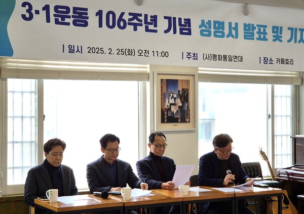 기독교 통일운동단체인 평화통일연대(평통연대·이사장 박종화 목사)가 25일 서울 용산구 효창교회에서 기자회견을 열고 3·1운동 106주년을 맞아 '민주공화 정신으로 나라를 되살리고 앞으로 나아가자'는 성명을 발표했다.