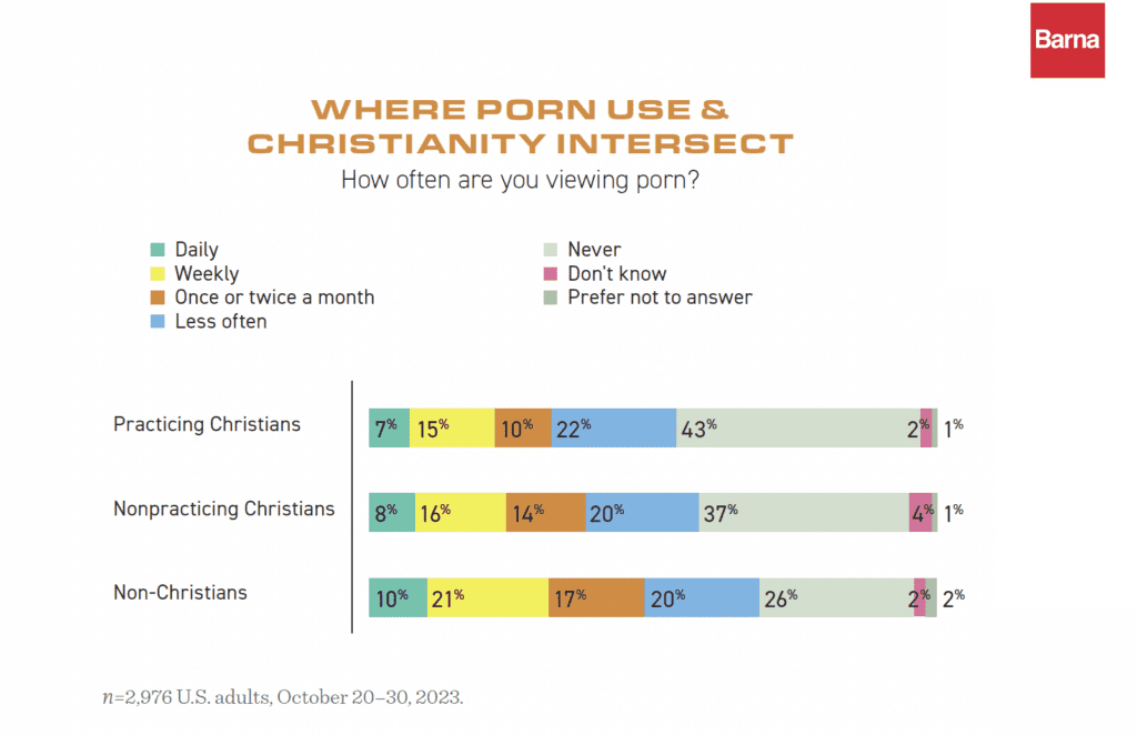 실천하는 기독교인의 54%가 적어도 가끔 포르노를 소비한다고 보고한 반면, 비기독교인의 68%는 포르노를 소비한다고 답했다