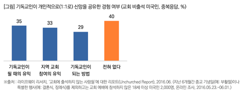 그들은 기독교인으로부터 1:1로 신앙적 대화 또는 교회 초청을 받았는지에 대한 답으로 언처치드(Unchurched)의 40%는 ‘그런 경험이 전혀 없다’고 응답했다.
