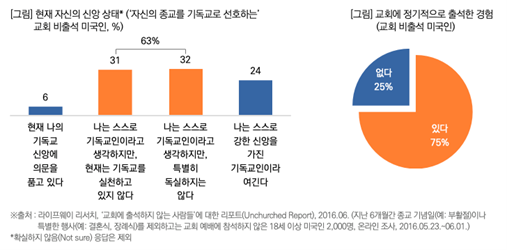 한편, 언처치드 4명 중 3명(75%)은 과거 정기적으로 교회에 다닌 경험이 있는 것으로 나타나, 언처치드(Unchurched) 그룹이 처음부터 교회 밖에만 있었던 집단이 아님을 확인할 수 있다.