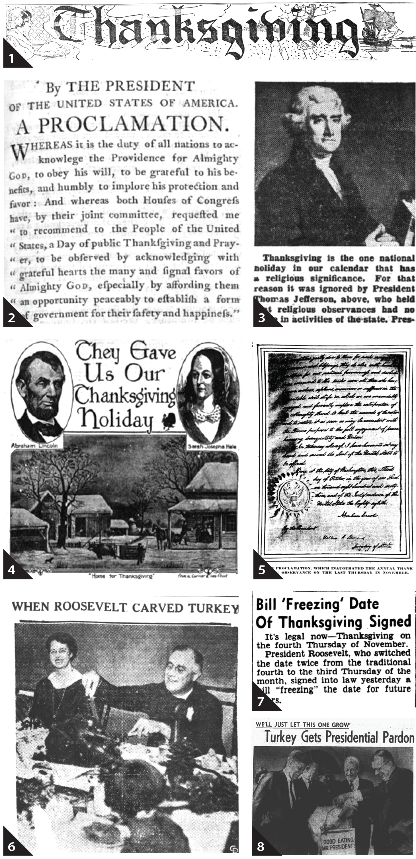 3. 1939년 신문에 실린 토머스 제퍼슨 대통령의 초상화. 초상화 아래에는 대통령이 종교적 의미 때문에 이 명절을 무시했다는 내용이 적혀 있다. 노갈레스 국제공항 (노갈레스, 애리조나주), 1939년 11월 25일,