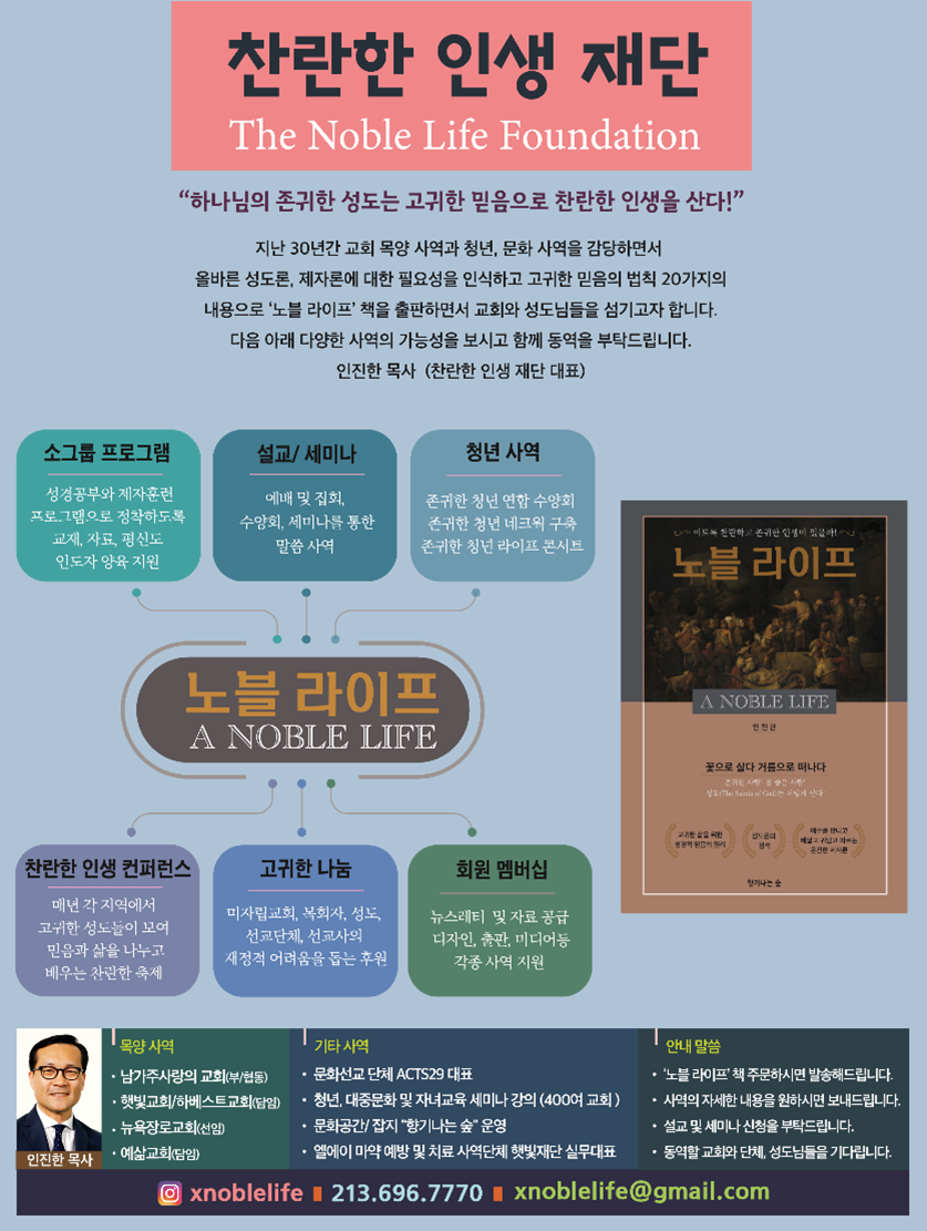 인 목사는 노블라이프를 근간으로 각 교회 및 공동체를 섬길 예정이다. 서적 구입이나 관련 문의는 (213)696-7770 으로 연락하면 된다.