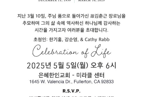 [미주교계뉴스] 故 김춘근장로, 추모식 오는 5월5일 은혜교회서 크리스천헤럴드2025.04.29