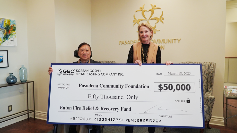 미주복음방송(사장 이영선 목사)은 진나 3월 18일 오전 11시, Pasadena Community Foundation(PCF)을 방문하여 산불 피해 복구를 위한 지원금 50,000달러를 전달했다. 이번 기부금은 최근 Eaton 화재로 피해를 입은 Altadena 및 Pasadena 지역 주민들을 돕기 위해 PCF가 설립한 'Eaton Fire Relief & Recovery Fund'에 사용될 예정이다.
