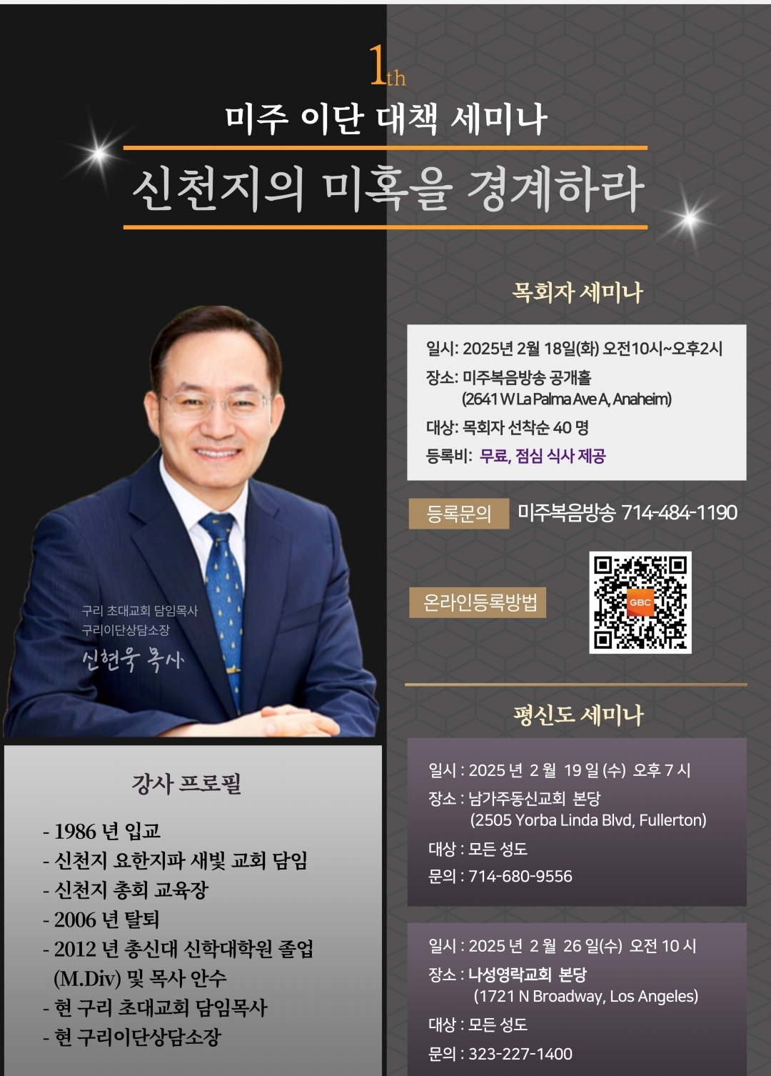 한편 ‘남가주 평신도를 위한 이단 세미나 ’도 OC 지역은 남가주동신교회에서 2월 19일 수요일 오후 7시에 (문의: 714-680-9556), LA 지역은 나성영락교회에서 2월 26일 수요일 오전 10시에 (문의: 323-227-1400) 각각 개최된다.
