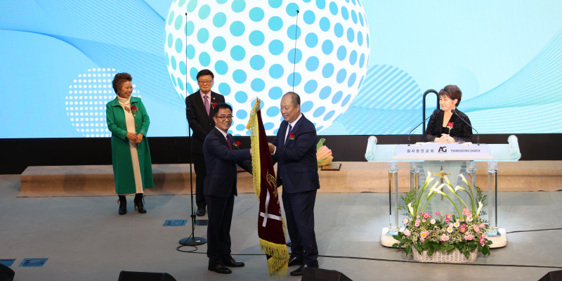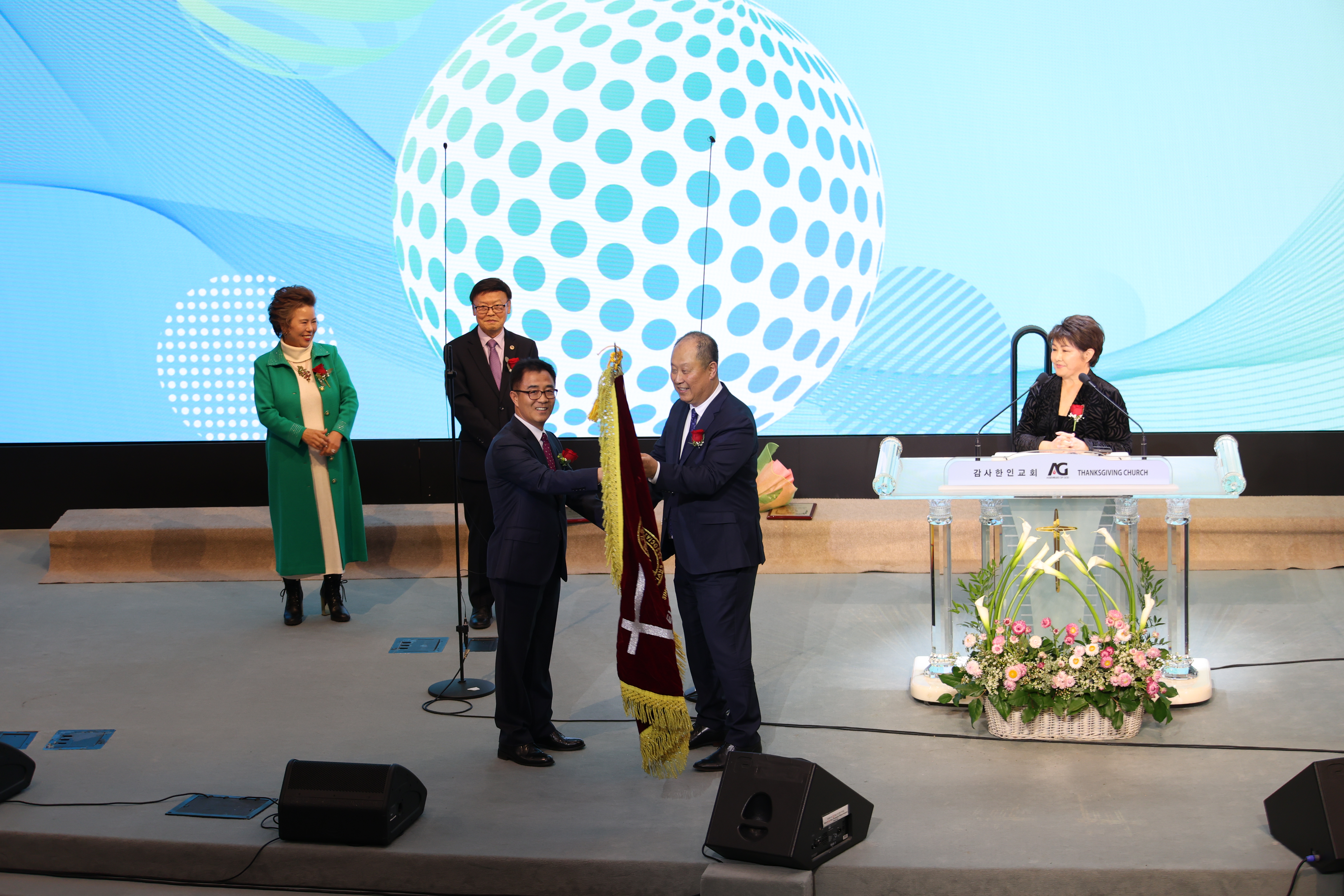 OC연합회 한성준 신임회장이 김도영신임이사장과 이임하는 민김 권사가 지켜보는 가운데 이임하는 신용회장으로 부터 회기를 받아들고 있다.