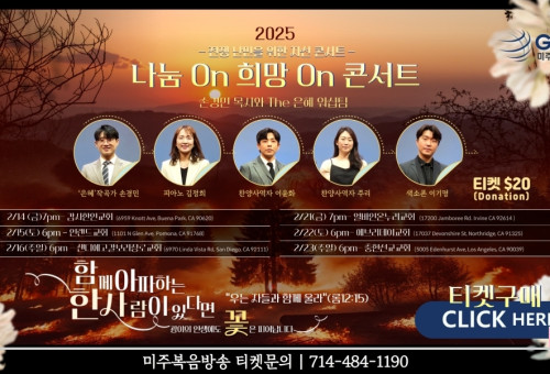 지역사회의 소외된 이웃과 세계 곳곳에서 전쟁과 재난으로 고통받는 이들을 돕기 위한 미주복음방송의 ‘나눔On 프로젝트’는 2025년에도 변함없이 진행된다. 미주복음방송의 '나눔On 프로젝트'는 팬데믹이 발발했던 2020년부터 시작돼 지난 2024년까지 5년간 총 95만불의 후원금이 모금되었다.첫 나눔은 이웃과 지역사회의 도움이 필요한 개인 및 긍휼단체를 지원하는 일로 시작해서 올해는 특별히 ‘난민 돕기’에 집중해 분쟁과 전쟁 속에서 나라를 떠날 수밖에 없었던 미얀마 카렌족 난민과 팔레스타인 난민, 우크라이나 난민들을 지원할 예정이고, 더불어 지역사회의 소외된 이웃을 섬기는 ‘퍼스트 펭귄’은 자선단체 10여곳의 사역과 다음세대 크리스천 리더 양성을 위한 ‘동행과 상생’ 프로젝트를 위해서도 지원할 예정이다.이번 콘서트에는 한국 뿐 아니라 전 세계 이민 성도들에게 가장 사랑받는 찬양 작곡가 겸 예배인도자 손경민 목사와 The 은혜 워십팀(찬양 사역자 이윤화, 찬양사역자 주리, 피아노 김정희, 색소폰 이기명)이 함께 한다. 우는 자와 함께 울라(로마서 12장15절)" 말씀을 주제로 한 이번 컨서트는 2월 14일(금)부터~2월 23일(일)까지 감사한인교회, 인랜드교회, 샌디에고갈보리장로교회, 얼바인온누리교회, 에브리데이교회, 충현선교교회에서 각각 개최되며 후원티켓은 $20로 미주복음방송 웹사이트에서 온라인 구매 및 전화문의 구매가 가능하다.또한 2월 19일(수) 오전 9시부터 오후 6시까지 생방송으로 진행될 '2025 나눔On 공개모금생방송' 에서는 손경민 목사와 The은혜 워십팀이 참여해 생방송을 이끌어 갈 예정이고, 이 날은 전화나 온라인 결제를 통해 특별헌금으로 동참할 수 있다. [이 게시물은 크리스천헤럴드님에 의해 2025-01-11 14:04:36 특별기고에서 이동 됨]