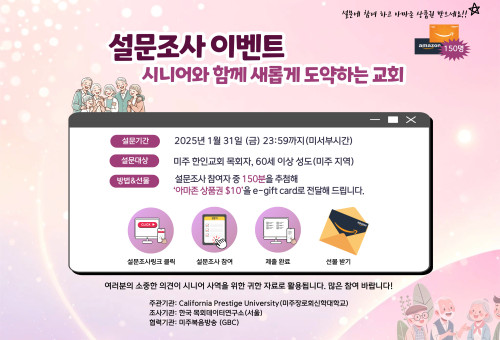 California Prestige University(미주장로회신학대학교)는 미주 한인교회 목회자와 시니어 성도를 대상으로 한국의 대표적인 기독교 전문 설문 조사 기관인 목회데이터연구소와 함께 현 미주 한인 교회 시니어 현황 및 시니어 사역을 위한 설문 조사를 실시한다.  미국 전 지역의 목회자 또는 60세 이상의 성도들을 대상으로 진행되는 본 조사는 설문 링크가 이메일이나 문자, 카카오톡의 메시지로 발송되어 누구나 간편하게 참여할 수 있으며 2025년 1월 말까지 실시할 예정이다. PULI(프레스티지 대학 평생교육원)의 이성희 원장은 “설문에 대한 성실한 답변 하나하나가 미주 한인교회 시니어 사역 준비를 위한 소중한 통계자료로 이어지므로 목회자들과 시니어 성도들의 적극적인 참여를 바란다”라고 요청했다. 또한, “섬기는 교회의 시니어 성도들에게 설문조사가 있음을 안내하고 참여하도록 돕는 목회자에게는 $10 상당의 아마존 상품권이 증정됩니다. 그리고, 설문을 완료한 분들에게 감사의 의미로 추첨을 통해 150명에게 $10 상당의 아마존 상품권이 e-gift card로 증정된다”라고 밝혔다.설문조사는 아래의 링크주소를 클릭하면 시작이 된다. 또한 California Prestige University의 홈페이지(www.ptsa.edu)와 학교와 협력하는 미주복음방송 등 여러 기독교언론 홈페이지에 게시된 설문 조사의 URL 주소를 이용하여 조사에 참여할 수 있다. 설문조사의 자료를 토대로 미주 한인교회의 시니어 사역에 관한 백서를 출간할 예정이며, 제2차 ‘시니어와 함께 새롭게 도약하는 교회’ 세미나를 통하여 이 자료들이 발표가 될 것이다. 현대 교회는 “고령화”라고 하는 시대적 난제를 맞고 있다. 특별히 미주 한인 이민 교회는 그 가속화가 더욱 심각하다. 이런 상황속에서 “어떻게 이를 극복하고 이민교회가 시니어와 함께 새롭게 도약 할 수 있을까?” 모두가 함께 고민하며 풀어 나가야 할 당면과제임이 분명하다. 그러기에 이번 설문조사는 너무나 소중하다. 많은 분들의 관심있는 참여와 기도가 정말 절실하다.  [이 게시물은 크리스천헤럴드님에 의해 2025-01-11 14:05:02 특별기고에서 이동 됨]