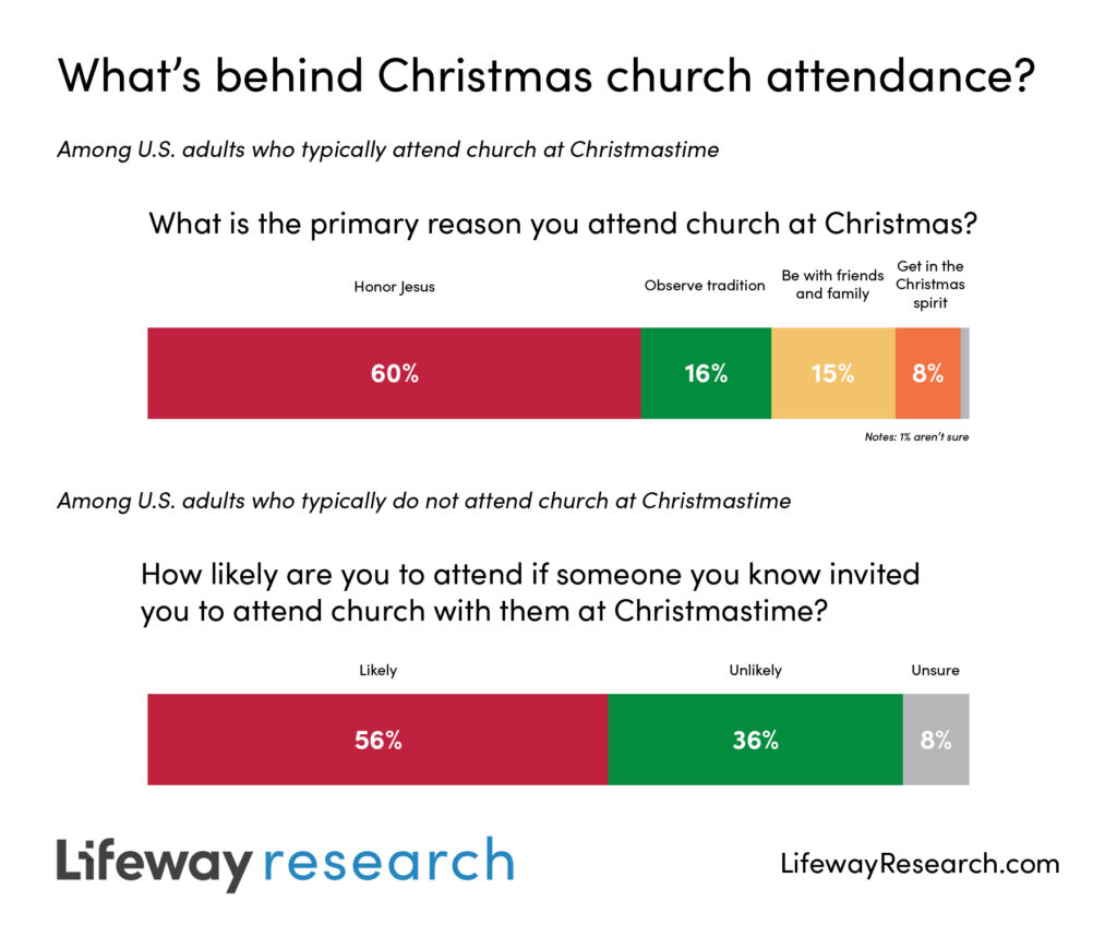 성탄절에 교회에 출석하는 응답자(47%) 중 대다수(60%)는 "예수님께 예배하기 위해"가 목적이라고 밝혔다. 특히 교회에 출석하는 빈도가 낮은 응답자는 성탄절에 교회에 출석하는 주된 이유로 '전통'을 꼽을 가능성이 높았는데 교회에 거의 출석하지 않거나 절기에만 출석하는 응답자 중 각각 22%와 27%는 "전통을 지키기 위해"라고 답 한 반면, 정기적으로 매주 출석하는 이들의 경우 그 같은 답변이 10%에 불과했다.