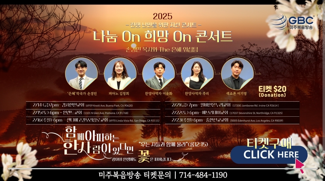 우는 자와 함께 울라(로마서 12장15절)" 말씀을 주제로 한 이번 컨서트는 2월 14일(금)부터~2월 23일(일)까지 감사한인교회, 인랜드교회, 샌디에고갈보리장로교회, 얼바인온누리교회, 에브리데이교회, 충현선교교회에서 각각 개최되며 후원티켓은 $20로 미주복음방송 웹사이트에서 온라인 구매 및 전화문의 구매가 가능하다.