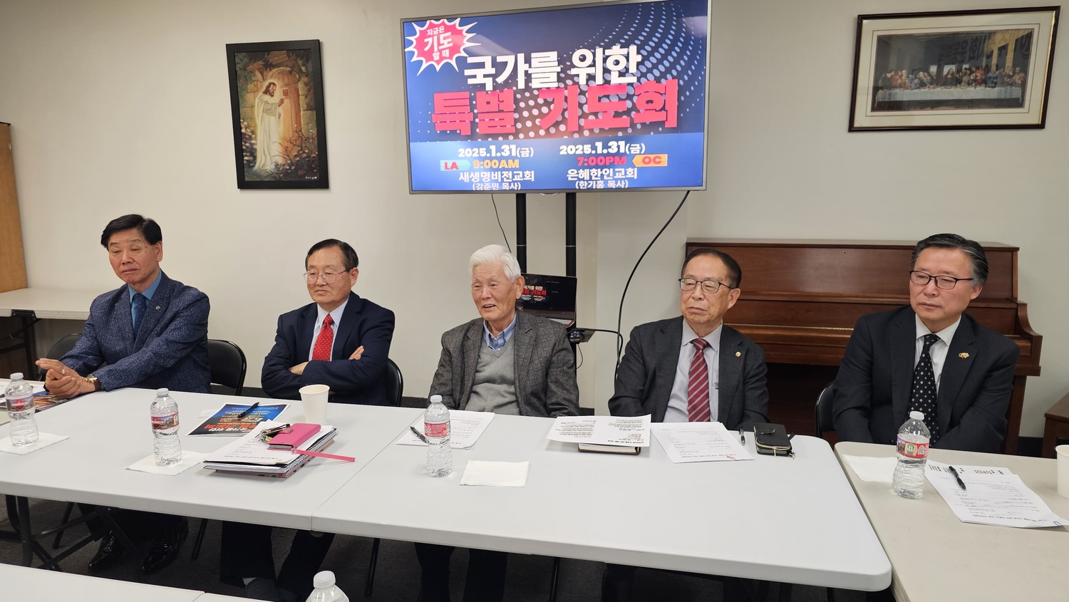 사진 설명: 다민족연합기도운동본부의 강순영목사와 미주성시화운동본부의 송정명 목사, 김재원이사장 등 관계자들이 성시화 사무실에서 지난 22일, 국가를 위한 특별 기도회 기자회견을 열고 있다.