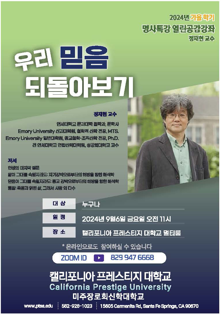 캘리포니아 프레스티지 대학교(California Prestige University, 구 미주장로회신학대학교)는 2024 년 9 월 6 일 금요일 오전 11 시, 미주 지역에 사는 기독교인이면 누구나 참여할 수 있는 명사 특강 열린공감강좌를 연다.