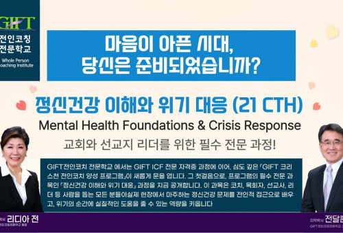 GIFT 전인코칭 전문학교가 'GIFT 크리스천 전인코치 양성 프로그램(GIFT Christian Whole-Person Coach Training Program, CWCTP)'을 공식적으로 출범했다. CWCTP는 신앙(영성), 심리(마음), 건강(신체), 코칭(관계/실천)의 4대 영역을 통합하여 기독교적 가치 위에 서 있는 전인적 코칭 전문가를 양성하는 데 집중한다.GIFT 측은 "CWCTP는 임상심리학 박사와 의학박사 등의 최고 교수진이 현장 경험과 과학적 지식을 성경적 원칙과 결합해 보다 깊이 있고 효과적인 코칭을 가능하게 한다."며, "이러한 전문성을 통해 개인과 공동체의 전인적 회복과 성장을 이끌 리더를 배출할 것"이라고 밝혔다.첫 번째 필수 전문 과목은 '정신건강 이해와 위기 대응 (Mental Health Foundations & Crisis Response, 21 CTH)' 과정이다.이 과목은 목회자, 선교사를 포함한 코치 및 리더들이 현장에서 마주하는 불안, 우울, 위기 상황에 대한 실질적인 이해와 개입 기술을 습득할 수 있는 필수 전문 과정으로 학력이나 배경에 상관없이 누구나 전문가로 성장할 수 있는 기회를 제공한다.  CWCTP 전체 과정을 등록하여 체계적인 교육을 시작할 수도 있고, 단일 과목만 수강하거나 청강 등록도 가능하다.수료 시 미국 Mental Health First Aid (MHFA) 공식 자격증이 발급되며 , 모든 학점은 샬렘 국제 대학원 석사 학위 2학점으로 인정된다. 또한, 본 과정은 21 CTH (Coaching Training Hours)로 공식 인정된다.'정신건강 이해와 위기 대응' 과정은 총 7주간 10월 27일 개강하여 매주 월요일 저녁 7시부터 10시까지(미 서부 시간) 온라인 ZOOM 라이브로 진행된다. 등록하시는 모든분들에게 런칭 기념 특별 할인 및 입학 등록비 $200 전액 면제가 제공된다. 또한 목회자, 선교사, 사모에게는 $200 특별 장학금도 제공된다.문의 및 신청:웹사이트: https://giftcoachinginstitute.com/ko/714-298-1115 info@giftcoachinginstitute.com