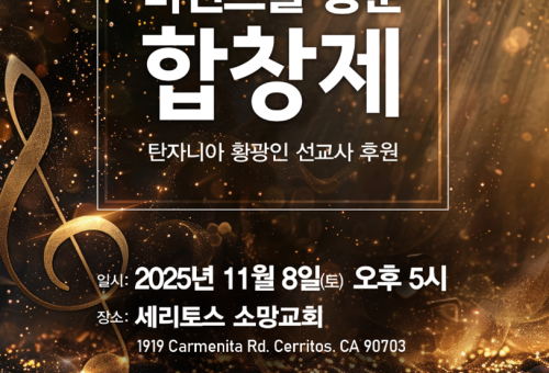 한국 소재 미션하이스쿨 동문 합창단들이 선교사 후원을 위해 매년 개최하고 있는 합창제가 올해는 탄자니아 황광인 선교사 후원을 목적으로 개최된다. 세리토스 소망교회(1919 Carmenita Rd., Cerriotos)에서 개최되는 이번 음악회는 순번에 따라 숭의여고 동문합창단인 숭의코러스(단장 장혜숙 권사)가 주관하고 미션스쿨동문합창단 연합회가 주최한다.   올해 참가 동문 합창단은 정신여고의 정신동문코러스(단장 박해경/지휘 한효정/반주 이예다), 경신고 경신코랄(단장 노용주/지휘 장진영/반주 제인김, 이화여고 동창합창단(단장 박영신, 지휘 민재희/반주 박헬렌), 배재고의 배재코랄(단장 김요섭/지휘 김원재/반주 고윤아), 그리고 숭의여고의 숭의코러스(단장 장혜숙/지휘 이선경/반주 하승현) 등 모두 5개 동문합창단이다.   이번 합창제로 마련되는 기금은 아프리카 탄자니아 도도마 지역에서 말라이카 유치원 운영으로 사역중인 황광인 선교사내외를 지원하게 된다. 말라이카는 스와일러 어로 “천사” 라는 뜻으로 가정의 울타리를 잃은 고아들과 미혼모 가정의 자녀들을 위해 세워진 작은 미션스쿨이다.   행사는 11월8일 토요일 오후 5시, 세리토스소망교회에서 열린다.