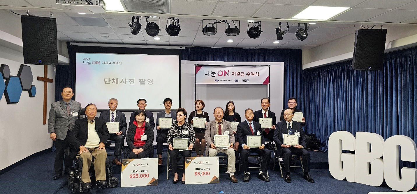 미주복음방송(사장 이영선 목사)이 지난 25일 월요일 오전 11시, 미주복음방송 공개홀에서 ‘나눔On지원금 수여식’을 진행했다. 나눔On캠페인은 코로나 팬데믹이 발발했던 지난 2020년, 어려움을 겪는 이웃들을 위해 마음과 물질을 나누고자 시작되어 올해로 5회째를 맞이하고, 그동안 커뮤니티의 자선단체와 재난을 당한 해외 선교지를 돕는 일로 확장되어 올해는 4곳의 선교지와 11곳의 자선단체를 지원하게 되었다.