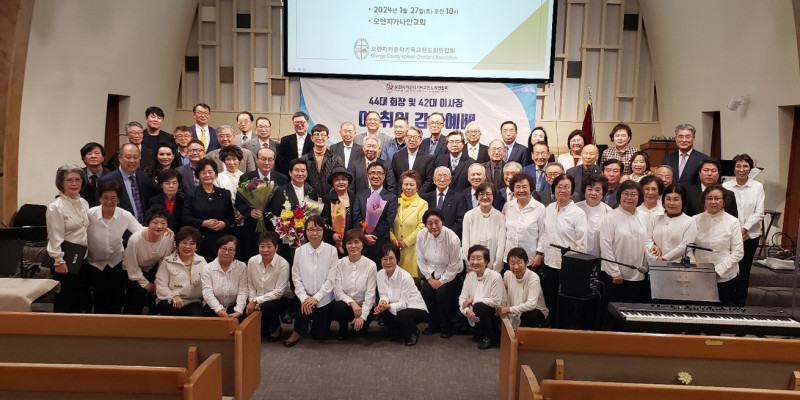 OC기독교전도회연합회(이하 연합회, 회장 신용)가 27일(토) 오렌지가나안교회(담임 김인철 목사)에서 44대 회장 42대 이사장 이취임 감사예배를 드렸다. 44대 회장에는 현 신용 회장이 연임하고, 42대 이사장에는 직전 회장을 역임한 민김이 취임했다.