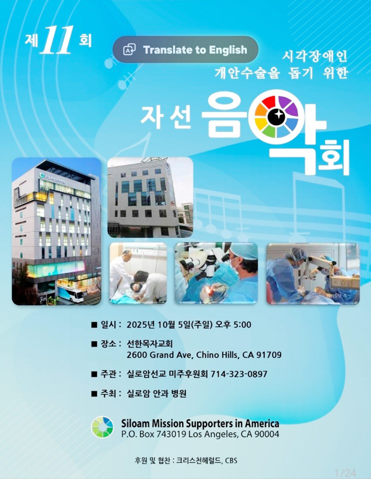 실로암선교 미주후원회(이사장 홍춘만 목사·회장 용장영 목사)는 오는 10월 5일 오후 5시 치노힐에 있는 선한목자교회(담임 고태형 목사)에서 ‘시각장애인 돕기 자선 음악회’를 개최한다.