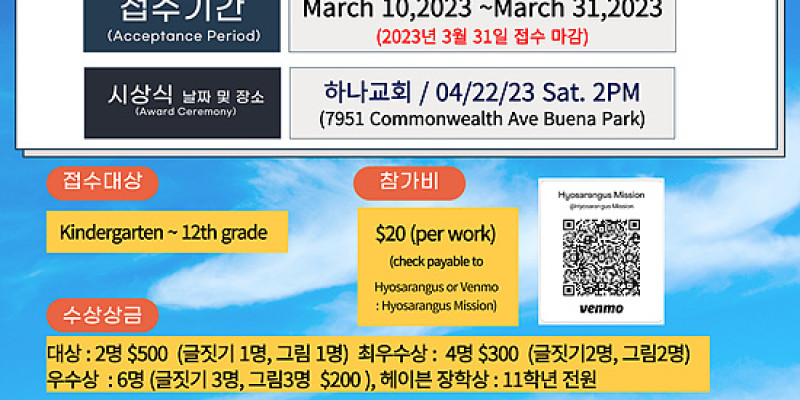 효사랑 선교회는 매년 특별한 주제로 많은 청소년들이 참여할 수 있도록 독려하고, 공정한 심사를 통해 우수한 작품을 선정해서 시상해 오고 있다. 지난 해에는 코리안 어메리칸으로, 크리스천 정체성이 분명한 정치인이 86명의 모든 참가자를 비롯한 수상자에게 직접 상장을 수여하고, 격려와 축하의 메시지를 전달해 의미를 더했다.