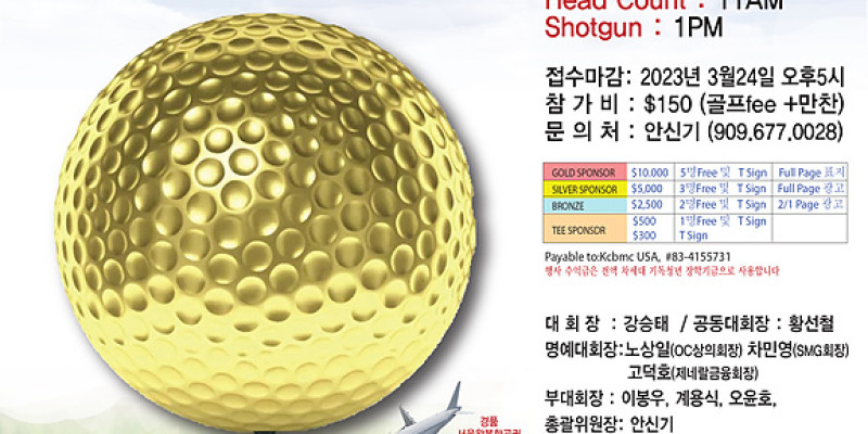 샷건으로 진행되는 이 골프대회의 참가비는 150달러(그린피와 저녁), 접수 마감은 오는 3월 18일 오후 5시까지이다. 홀인원은 상금 3만 달러이며 올해 대회 특별 후원은 한솔 보험, 서울 메디컬 그룹, 세계한인 교민청, OC한인상공회의소, 제너럴 파이낸셜 그룹 등이다.