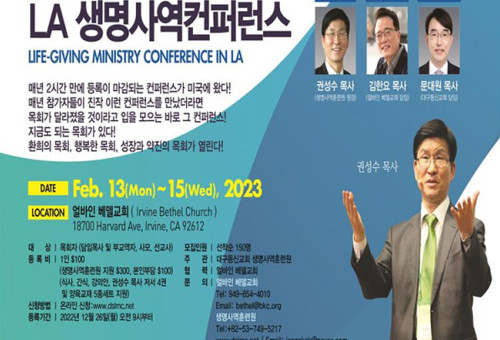 어바인 베델교회(김한요 목사)는 대구동신교회 생명사역훈련원(원장 권성수 목사)을 초청해 2023년 2월 13일 부터 15일 까지 미주서부지역 목회자, 사모, 사역자들을 대상으로 ‘LA 생명사역 콘퍼런스’를 개최한다.  ‘생명사역’이란 예수님이 지상에서 하셨던 사역(마 9:35)으로 ‘천국복음으로 사람을 살리고 키우고 고치는’ 사역이다.  전교인이 생명사역자로 변화된 대구동신교회는 수 년 동안 부흥과 성장(2022년 기준으로 예산 15배, 22년 동안 교인 수 800명에서 8,000명으로 성장)을 경험하였다.   ‘생명사역 콘퍼런스’의 주강사인 권성수 목사는 총신대학교(합동)에서 14년간 교수로 재직하였고 대구동신교회에서 22년간 목회를 하면서 신학과 목회의 균형을 이룬 참목회자로 유명하며 올바른 성경 신학으로 생생한 성령의 변화를 일으키는 생명사역 목회철학을 사역에 접목시키면서 환희의 목회를 경험하고 있다.  ‘안된다’, ‘어렵다’라는 목회현장에서 ‘된다’, ‘쉽다’라는 환희의 목회철학을 공유하고, 한국교회의 앞날에 대한 진정한 고민과 해결점을 제시하고자 콘퍼런스를 열게 되었다는 권성수목사는 한국에서는 매년 4월에 개최되는 콘퍼런스는 인터넷 접수를 시작하자마자 마감이 될 정도로 전국의 많은 목회자들이 관심을 가졌던 바 있다.  이번 콘퍼런스는 생명사역 목회철학이 담긴 생명사역리더십, 성경을 강해(설교)하여 성령으로 변화시키는 성령설교, 생명사역을 접목시킨 지교회의 사례발표 등 다양하고 깊이가 있는 강의를 준비하였다.  이번 베델한인교회에 열리는 생명사역 콘퍼런스에 참가하는 목회자들에게는 개인부담 등록비 100불로 사역원에서 $300불 상당을 지원하게 되는데 생명사역을 접목시킨 대구동신교회 생명사역 자료들을 제공 받으며 식사, 간식, 강의안 권성수목사 저서 4권 및 양육교재 5종세트등이 포함된다.  현재 생명사역훈련원 홈페이지(www.dslmc.net)에서 등록 받고 있으며 등록비는 $100로 등록시 생명사역을 위한 필독서 5권과 성도 훈련 교재 5종류 10권을 지원하며, 점심과 저녁 및 간식을 제공한다. 자세한 문의는 생명사역훈련원 홈페이지(www.dslmc.net)이나 이메일(jangskok@naver.com)으로 할 수 있으며, 얼바인 베델교회 사무실(949 854 4010)에서도 확인할 수 있다.