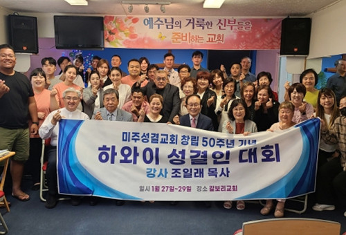미주성결교회 창립 50주년 기념 ‘하와이 성결인대회’가 지난 1월 27일 부터29일 까지 하와이 갈보리교회(제키 카오후 목사)에서 열렸다. ‘먼저 하나님의 소원’이란 제목으로 강단에 선 전 총회장 조일래 목사(목자재단 이사장, 수정교회 원로)는 “그리스도의 복음을 전해 영혼을 구원하는 것이 하나님의 소원”이라면서 “성령 충만 받고 하나님의 자녀답게 살면서 하나님의 소원을 이루는 데 힘써야 한다”고 선포했다. 조 목사는 또한 "하나님의 말씀을 듣고 행하는 자가 지혜로운 자"라며 "하나님 앞에 섰을 때 하나님의 영광을 위해 살았노라고 당당히 말할 수 있어야 한다"고 말했다. 조 목사는 성도가 세상을 살아가는 5가지 자세도 권면하면서 “하나님께는 순종하고, 마귀는 대적하고 목회자들에게 협력하며, 이웃을 내 몸처럼 사랑하고, 자신은 희생해야 한다”면서 “자기희생 없이는 이 모든 것이 불가능하다고 강조했다.”고 전했다.  제키 카오후 목사는 세 차례 열린 집회에 대해 “코로나 기간에 느슨해진 신앙을 점검하고, 그동안 추구했던 방향과 목표를 재확인하는 은혜로운 집회였다”고 말했다. 기독교대한성결교회 미주총회 총무 김시온 목사도 성결인대회에 참석해 한국 목자재단과 갈보리교회 성도들을 격려하고 감사의 마음을 전했다. 김 총무는 “이렇게 멀리 미주까지 와서 성전 리모델링과 성결인대회를 인도해주셔서 감사하다”면서 리모델링 후원금 등 6,300달러를 전달했다. 황지혜 전도사(갈보리교회)는 “140년 전 미국에서 한국을 선교했는데, 이제는 한국이 미국을 선교하게 돼 감격스럽다”며 “받은 만큼 하와이와 열방을 향해 사랑을 나누고 복음을 전하는 데 힘쓰겠다”고 말했다. 올해 미주성결교회 창립 50주년 행사가 하와이에서 열린 것은 이번이 처음이다. 목자재단은 미국 한인 이민교회의 재활성화와 성결교회의 정체성을 드높이기 위해 하와이 리모델링 사역 및 성결인대회를 마련했다.