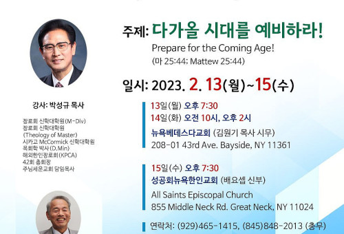 박성규 목사(주님세운교회 담임)는 2월13일 부터15일 까지 “다가올 시대를 대비하라!”라는 주제로 뉴욕지구한인교회협의회가 주최하는 "목회자 및 평신도지도자 세미나와 부흥성회"를  인도한다.  세미나는 13일 월요일 오후 7시 30분과 14일 화요일 오전 10시와 2시에는 뉴욕베데스다교회(김원기 목사)에서 15일 수요일 오후 7시 30분에는 성공회뉴욕한인교회(배요셉 신부)에서 각각 진행된다. 박성규 목사는 이번 세미나에 대해 “뉴욕의 성시화와 청교도신앙 회복을 위해 준비하며 다가오는 시대를 예비하는 영적지도자들로 무장하여 복음을 힘있게 전하는 예수 그리스도의 강한 군사로서 성령충만한 삶을 살아가게 만드는 것이 집회의 목적이다.”라고 소개했다. 박성규 목사는 뉴욕 집회 후 2월16일 부터 19일 주일까지 노스캐롤라이나 훼잇빌 벧엘한인장로교회에서 “예수를 바라보자(히12:3)”라는 주제로 부흥성회를 인도하게 된다.  부흥성회는 2월16 일 목요일 저녁에는 “인정받는 신앙(눅23:39~43)”라는 주제로 성회가 시작되며, 17일 금요일 새벽에는 “떠오른 도끼날(왕상 6:1~7 )”,  17일 금요일 저녁에는 “자녀의 권세(엡2:1~7)”, 18일 토요일 새벽에는 “하늘이 열리며(눅 3:21~22)”, 18일 토요일 저녁에는 “뜨인돌이 신상을 치리라(단 2:31~35)”, 19일 주일에는 “위대한 소원을 품으라(빌1:20~21)”를 주제로 각각 집회가 진행된다. 박성규 목사는 장로회신학대학원(M.Div)를 졸업하고 장로회신학대학 대학원(Th.m), 시카고 McCormick신학교 목회학박사(D.min)학위를 취득한 후 해외한인장로회(KPCA)총회장을 역임하고 있으며 주님세운교회를 담임하고 있다.
