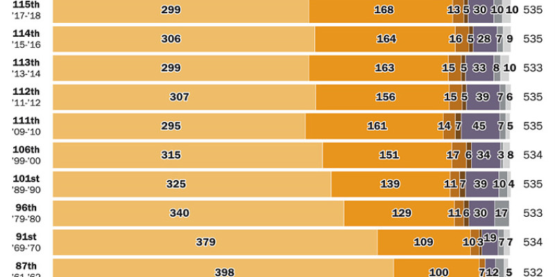 최근 회기 때와 마찬가지로 새 의회의 유일한 의원인 애리조나에서 무소속인 카스텐 시네마 상원의원만이 종교적 무당파라고 밝히고 있다. 또 하나(민주당 의원). 자레드 허프먼(캘리포니아)은 자신을 인본주의자라고 표현하고 있으며 20명은 알려지지 않은 종교 신자로 분류된다. 이 분석의 주요 데이터 소스인 CQ Roll Call의 질문을 받았을 때 이들 구성원의 대부분은 종교 관련 진술을 거부했다.