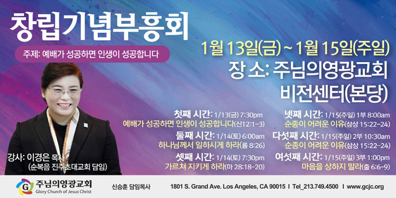 주님의영광교회(신승훈 목사 담임)가 창립 24주년을 맞아 1월 13일 금요일 부터 15일  주일까지 3일간 주님의영광교회 비전센터(본당) 1801S.GrandAve.LosAngeles에서 창립기념부흥성회를 개최한다.