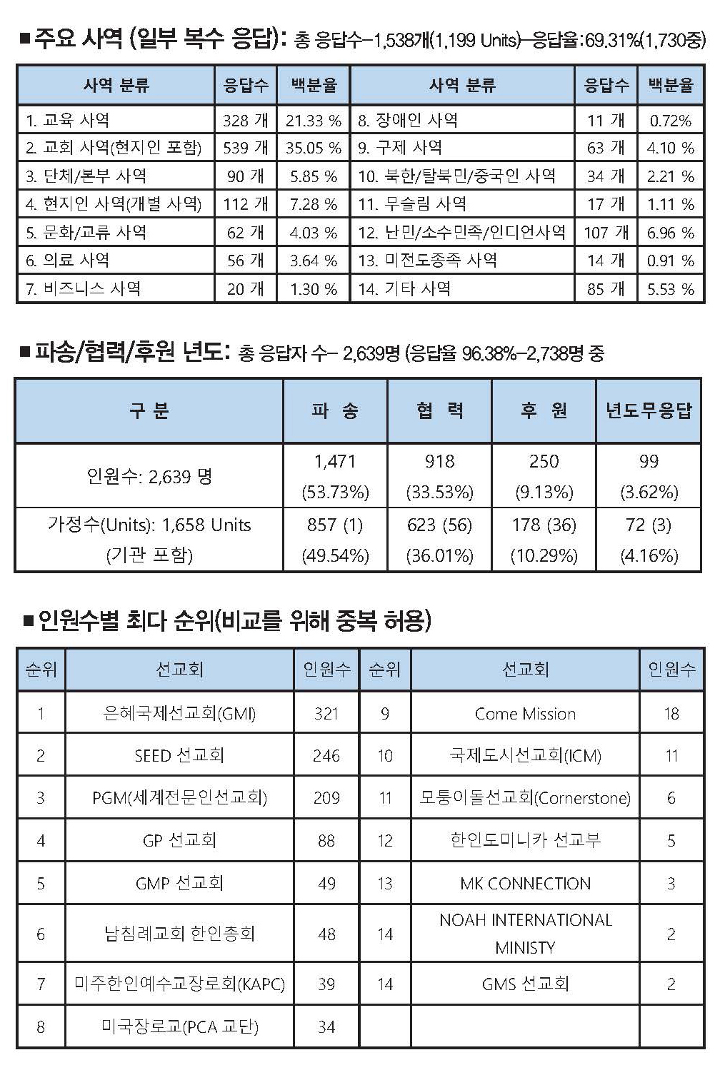 전체 선교사의 총 응답자 수는 2,639명으로 파송은 1471명으로 약 54%, 협력선교사는 918명(33.5%), 후원선교사는 250명(9.1%)였다