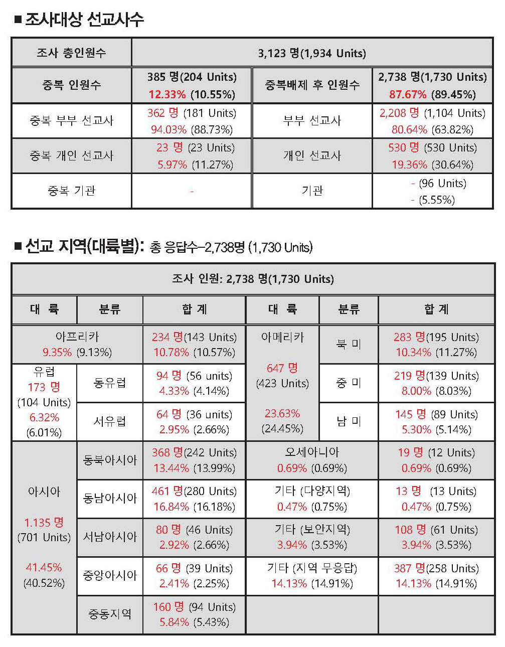 조사 대상: 125 개 교회·단체 중 48 개 교회, 15 개 선교단체 응답 (응답률 50.40%)로 총 파송/협력 선교사: 2,738 명 (1,730 가정) - 부부 선교사: 약 80% / 개인 선교사: 약 20% 로 밝혀졌다.