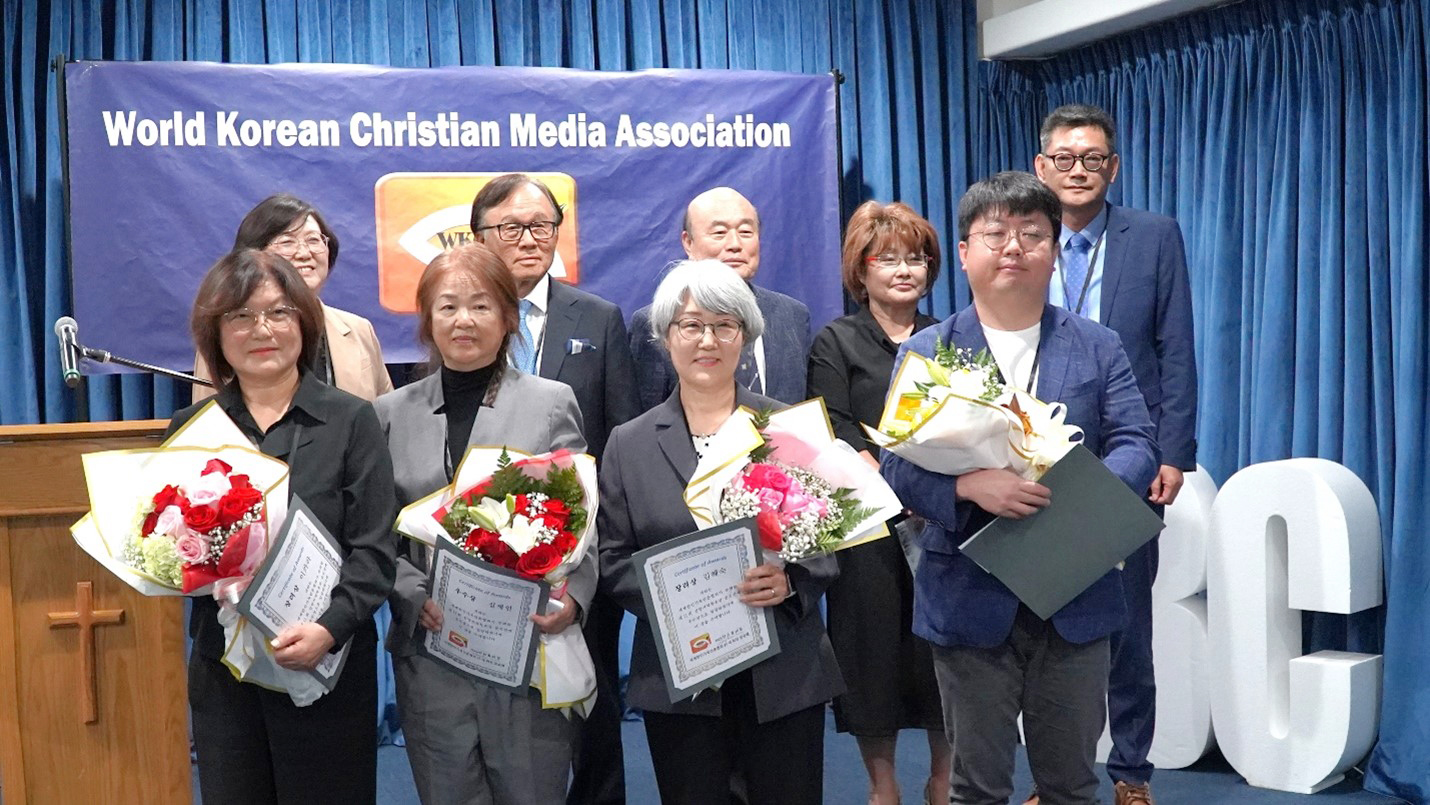 시상식에 참석한 수상자들. 앞줄 왼쪽부터 이카라, 심제인, 김혜숙, 김영준 씨, 뒷줄 왼쪽부터 부회장 이성자전도사, 부회장 조명환목사, 회장 임승쾌장로, 서기 윤우경권사, 심사위원장 백승철목사.