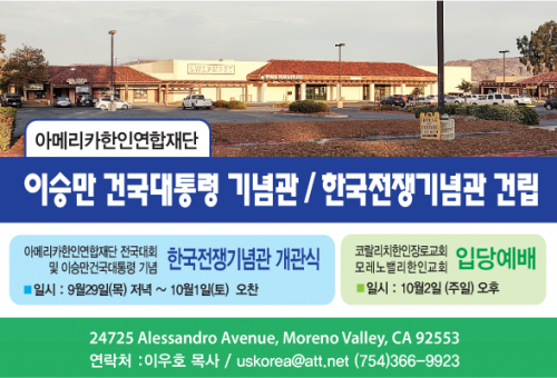 아메리카한인연합재단(총회장 이우호목사, 이하 연합재단)이승만 건국대통령 기념관과 한국전쟁기념관 회관 건립을 발표하면서 완공을 위해 박차를 가하고 있다고 발표했다. 그동안 연합재단이 장기간 기도하며 준비해온 '이승만건국대통령 기념-한국전쟁기념관' (가칭)이 건립의 꿈이 드디어 이루어지게 된 것이라 기쁜 소식을 전하는 이우호목사는 오는10월1일이 이승만 대통령의 날로 선포되어진 LA 카운티의 월넛 시와 OC카운티의 라팔마 시에 이어 앞으로 여러 지방 도시에서 동일한 선포가 이어지도록 노력하고 있는 가운데 바로 그날, 개관식을 개최하고자 계획 중에 있다면서 이 일을 위하여 역사적 자료가 많이 필요하다고 밝혔다  이승만 대통령 관련 사진과 자료들을 공개 수집하여 “한 눈에 보는 한국역사”로 시작하고자 하오며 한국전쟁기념관에는 한국전쟁에 사용되었던 탱크나 대포 각종 총기류 군복등의 기부나 기증을 환영하며 동포 여러분의 많은 협조를 요청했다. 아울러 아메리카한인연합재단 전국대회를 9월29일(목요일) 저녁 부터 '이승만 대통령의 날' 10월1일(토요일) 오찬까지 개최하기로 하면서 기쁘고 의미 있는 행사가 되도록 많은 참여를 권했다.  더불어 모레나밸리한인교회 입당예배는 10월2일 주일 오후에 개최될 예정이다.기념관 건물의 구입은 완료되었지만 완전한 기념관이 완공되기까지는 시간과 노력이 여전히 필요하다고 밝힌 이목사는 완공 후에는 한인회나 각 기관들에게 문을 열어 최대한 1천명이상이 각종 행사장으로 사용할 수 있게 될 것이라고 기대감을 표했다. *전국대회 및 이승만건국대통령 기념-한국전쟁기념관 개관식 일정   9월2일(목) 저녁 부터 10월1일(토) 오찬까지 *코랄리치한인장로교회/모레노밸리한인교회 입당예배 10월2일 주일 오후 *이승만건국대통령기념-한국전쟁기념관(가칭) 완공을 위한 기도제목 *의자 1천개 이상  *음향 시스템 및 악기 *전기시설 * 부엌관련 시설 *내외부 단장 및 건물 싸인 * 주차장 공사 및 *내부시설을 위한 헌신과 기부 자유대한민국의 미래를 캘리포니아에 심을 수 있는 아름다운 기념관, 전시관을 동포들과 함께 건립하고자 기대 찬 소감을 밝힌 이우호목사는 아울러 현재 전국대회나 선교사님들 방문 시 사용될 숙소를 위해  12개 아파트유닛 구입을 완료했다. 엘에이 지역과 오렌지카운티 지역 중간 정도의 위치로 5번 프리웨이 근방 노르웤 지역이다. 문의 이우호목사 / 754 366-9923