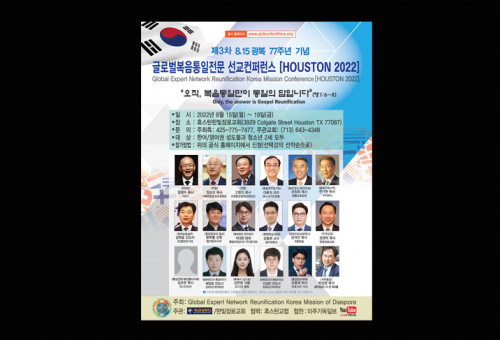 제3차 글로벌복음통일전문선교콘퍼런스 포스터. 남북한의 긴장 관계가 풀리지 않는 가운데 복음을 이용한 통일 만이 한반도에 진정한 평화와 통일을 가져다준다는 것을 알리기 위한 콘퍼런스가 미주 한인들을 중심으로 개최된다.글로벌복음통일전문네트워크(대표 임현수 목사)는 오는 8월 15일부터 19일까지 텍사스 휴스턴 한빛장로교회(담임 정영락 목사)에서 ‘제3차 글로벌복음통일전문선교콘퍼런스’를 개최한다. 이와 함께 2022년 복음통일상 공모전을 개최해 미주 한인 기독교인들에게 복음통일의 중요성을 알릴 계획이다.‘오직 복음통일만이 답이다’라는 주제로 개최되는 이번 콘퍼런스는 북한에서 고문과 억류를 당한바 있는 임현수 목사를 비롯해 수원중앙침례교회 고명진 목사, 흰돌교회 오창희 목사를 비롯해 ‘바로서다’ 이사 조평세 박사, 통일징검다리 ‘우리온’ 박대현 대표, 극동방송 강석진 목사, 유니티 미션 김요한 목사 등 북한선교 전문가들이 참가한다.특히 이번 콘퍼런스는 북한에서 탈출해 현재 한국의 신학대학에서 신학을 공부하고 있는 남녀 탈북자 13명이 참석해 북한의 상황과 탈북의 과정 등을 통해 역사하신 하나님의 은혜를 간증할 계획이다.글로벌복음통일전문네트워크 대표 임현수 목사는 “준비가 안 된 통일은 아무런 의미가 없다”며 “ 교회 지도자들이 복음통일의 진정한 의미를 깨닫고 한반도 평화의 중재자들로 나서야 한다”고 말했다. 계속해서 임 목사는 “남과 북을 화해시키는 하나님의 사람들이 교회에서 일어나야 진정한 통일로 이끌 수 있다”며 “이번 콘퍼런스를 통해 미주 한인교회들이 조국을 살리는 운동에 일어나기를 기대 한다”고 말했다. 이번 콘퍼런스는 다양한 분야에서 활동하고 있는 북한선교 전문가들이 참가하는 만큼 북한에 기독교인들을 위해 필요한 것이 무엇인지부터 북한선교를 위한 준비사항이 무엇인지 등을 확인한다. 탈북청년들의 정착을 위해 실제로 지원해야 할 것이 무엇인지, 교회들이 관심 가져야 할 부분이 무엇인지 등도 깊이 있게 짚어볼 예정이다.이번 콘퍼런스는 또 한반도의 진정한 통일을 위해서 하나님의 적극적인 개입이 필요하다는 점을 인식하고 ‘복음통일’의 의미를 되새기는 집회가 매일 저녁 이어질 계획이다. 첫날은 임현수 목사가 ‘오직 복음통일 만이 답입니다’라는 주제로 설교하며 둘째 날은 고명진 목사가 ‘오직 복음으로’라는 제목으로 말씀을 선포한다. 마지막 저녁 집회는 오창희 목사가 ‘이 시대의 다니엘을 찾습니다’라는 주제로 설교한다.이와 함께 콘퍼런스 기간 중 통일 공모전을 개최해 미주 전체 한인 기독교인들에게 복음통일의 개념을 이해시키고 관심을 유도한다는 계획이다.공모전은 “내일 통일이 된다면”, “왜 복음통일인가”, “통일의 세계사적 의미” 등의 주제에 해당하는 포스터나 기도문, 동영상 등으로 참여하면 된다. 복음통일 포스터는 크기에 제한이 없다. 복음통일 기도문은 A4용지 2/3분량(글자 11포인트)으로 통일을 염원하는 기도문이나 연설문이면 된다. 동영상의 경우 2분 이내의 직접 촬영한 것으로 본인의 연설이나 복음통일을 필요성을 강조한는 내용으로 구성되면 된다. 응모 방법은 오는 8월 13일까지 작품을 휴스턴한빛장로교회(3929 Colgate Street, Houston, TX 77087) 보내면 된다. 이메일 gbmwusa@gideonbrothers.org로도 접수가 가능하다.글로벌복음통일전문네트워크 사무총장 박상원 목사는 “통일 시대의 주역이 될 젊은이들의 많은 관심과 참여를 바란다”고 말했다.공모전은 심사를 통해 콘퍼런스 마지막 날인 19일 발표되며 선정된 작품은 분야별로 1000달러 씩 상금이 주어진다. 자세한 내용은 홈페이지(gideonbrothers.org)를 참고하면 되며 (425)775-7477나 (713)643-4348로 문의하면 된다.