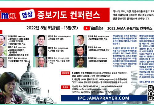 자마 영상 중보기도 콘퍼런스 광고 포스터.기도운동 단체인 자마(JAMA)가 주최하는 ‘온라인 중보기도 콘퍼런스’가 지난 8일부터 시작돼 오는 13일까지 이어진다.자마의 이번 중보기도 콘퍼런스는 당초 은혜한인교회에서 대면으로 개최할 예정이었지만 코로나19 재확산을 이유로 영상으로만 진행하기로 했다. 중보기도 콘포런스는 자마 홈페이지나 자마 유튜브 채널을 통핵 공개된 영상을 보며 제시된 기도제목을 따라 자유롭게 기도하면 된다.자마는 최근 참여를 독려하는 메시지를 남가주 교계 관계자들에게 보내며 기도의 중요성을 재차 강조했다. 자마는 창립자 김춘근 교수, 은혜한인교회 한기홍 목사, 자마 강순영 목사의 서명을 걸고 “하나님께서는 회개하고 돌아오면 뜻을 돌이켜 복을 주시겠다고 약속하셨다”고 강조했다.자마는 ⧍초자연적인 성령의 충만함으로 이 모든 위기로부터 회복시키는 하나님의 기도의 전사들이 되자 ⧍팬데믹으로 움추렸던 교회들이 기도를 통해 영적으로 다시 뜨거워져야 할 때다 등의 표현을 동원해 기도참여를 호소했다.자마의 온라인 중보기도 콘퍼런스는 은혜한인교회 한기홍 목사가 ‘교회의 부흥과 목회자들을 위한 중보기도의 중요성’을 강조할 예정이다. 또 김춘근 교수는 ‘비상 기도가 필요한 때’, ‘다음 세대 지도자를 준비’ 등의 제목으로 설교한다.필라안디옥교회 호성기 목사는 ‘다음 세대를 위한 기도’를 제시하고 시카고 지역의 강민수 목사와, 뉴욕의 허연행 목사, 북가주의 위성교 목사 등이 각각 가정과 한국, 미국의 지도자들을 위한 기도를 강조할 계획이다.메릴랜드 안지웅 목사는 청년부흥을 위해 기도할 것과 자마의 강순영 목사는 중보기도의 위력과 응답에 대해 짚어볼 예정이다. 큐티라이프미션의 김은애 권사가 중보기도와 말씀 묵상에 대해 설명하며 마무리 할 계획이다.참여를 원하는 교회는 교회의 상황에 맞게 동영상과 담임 목회자의 설교를 적절하게 배합하면 된다. 내용은 유튜브에서 2022 JAMA 중도기도 컨퍼런스를 검색하면 확인할 수 있다. 문의 (310)995-3936, (903)804-4016.