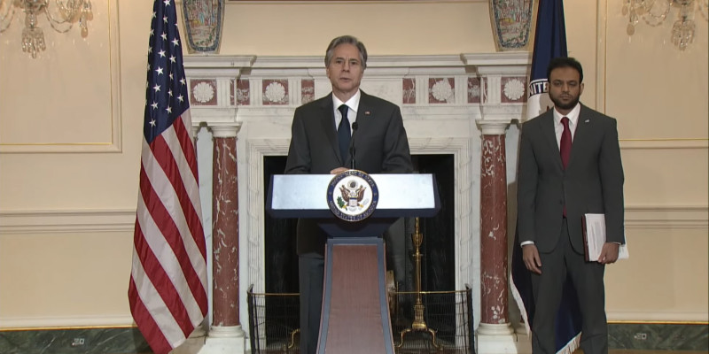안토니 블링컨 국무장관(왼쪽)이 라샤드 후세인 국제종교자유대사와 함께 지난 2일 연방 국무부에서 ‘2021 국제종교자유보고서를 발표하고 있다. 국무부 유튜브 동영상 캡쳐.