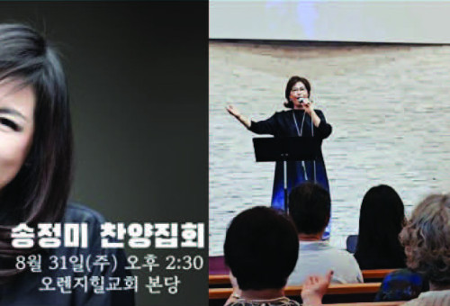 찬양사역자 송정미 사모의 미주 간증집회가 지난 8월초 미 동부 지역 워싱턴선한목자 교회 (최시영목사) 등에서 시작한 뒤 미서부 지역까지 두루 방문하면서 8월30일 코너스톤교회 (이종용목사)와  8월31일, 주일 오후, 오렌지힐 교회( 백창호목사)에서 마지막 컨서트를 끝으로 막을 내렸다. 오렌지힐교회에서 주일 오후 2시30분에 열린 이번 간증집회는 약 2시간 동안 인근 지역에서 찾아온 한인들과 성도들이 함께 찬양을 부르고 간증을 나누며 송사모의 외동딸 곽지은자매와의 듀엣 등, 아름다운 찬양과 진솔한 시간으로 하나님께 영광을 돌렸다. 집회를 마친 뒤 백창호목사는 본 교회에서 한 달간의 미주투어를 마친 송정미 사모의 귀한 간증과 함께 아름다운 찬양을 나눌수 있어서 교회에 큰 기쁨이라며 송사모의 요청으로 마지막 축복송을 함께 부르기도 했다. 관객석에 섞여 앉아있던 송사모가 “샬롬”이라는 찬양으로 영상과 함께 성도들을 향해 축복하며 시작된 컨서트는 1988년 한국극동방송 주최 복음성가경연대회에서 대상을 받으며 CCM계의 원조격으로 사역을 시작한뒤 어떻게 CCM음악과를 처음 개설하게 되고 교수로써의 사역을 이어갔는지, 18년 뒤 그 사역을 내려놓고 5대양 6대주를 찾아 하나님의 부르심에 선교사들을 섬기게 된 과정과 이스라엘 광야에서의 훈련 경험을 나누며 “내일을 알수 없는 미래속에 있는 성도들, 인생의 광야에 있다고 생각하는 성도들에게 찬양으로 위로를 전하고 싶다”고 고백했다. 송사모는 잠언 3장 말씀에 “너는 마음을 다하여 여호와를 신뢰하고 네 명철을 의지하지 말라, 너는 범사에 그를 인정하라 그리하면 네 길을 지도하시리라” 라는 말씀을 나누고 선교사의 꿈을 품고 찬양사역자의 길을 걸으며 이라크에서 순교한 김선희 선교사를 위해 기도했던 일, 또 선교사들의 장례식에서 조가를 부르며 하나님의 역사에 의해 순종의 의미를 깨달았던 간증도 나누었다. 송정미 사모는 연세대학교 성악과를 졸업하고 숭실대학교 주임교수, 호남신학대학교에서 청빙교수를 역임하고 현재는 CBS라디오와 극동방송에서 찬양 프로그램을 진행하고 있다. 또한 한국기독음악협회 회장을 맡으면서 현대기독교음악 교육에 헌신하며 후배 사역자들을 양성하고 있다.