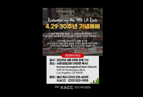 30년 전에 일어난 LA 4.29폭동에 대한 원인을 살피고 화합과 번영을 다지는 기념예배가 오는 29일 오후 7시 시온성결교회(담임 이대연 목사, 2149 W Washington Blvd. LA. CA)에서 개최된다. 한미기독연합회(KACC) 주최로 개최되는 이번 예배는 30주년을 맞이하는 4.29를 계기로 모든 민족과 더불어함께 살아갈 수 있는 세상을 만들기 위해 뜨거운 마음으로 함께 기도하자는 취지로 마련됐다.한편 4.29 폭동은 지난 1992년 4월 29일 일어난 LA코리아타운 무장폭동 사건이다. 당시 한인들이 힘을 모아 한인타운을 지켜낸 것으로 유명하다. 문의(213)215-6029, (213)522-1905.