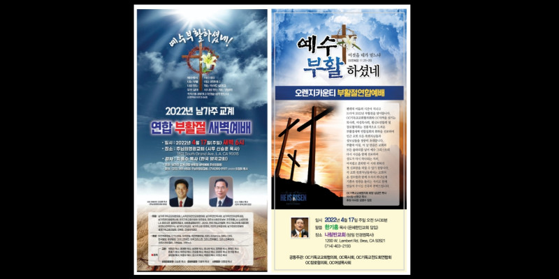 2022년 부활절 연합예배가 LAOC지역 한인 교계단체들 연합으로 각각 치러진다. 수년 동안 분열되어 온 LA지역 기관들이 올해 부활절을 함께 기념하기로 했다. OC지역은 최근 내분을 극복한 나침반교회에서 개최해 그리스도 안에서 하나됨의 의미를 더할 예정이다. 각 지역 연합예배 포스터. 왼쪽 LA, 오른쪽 OC.