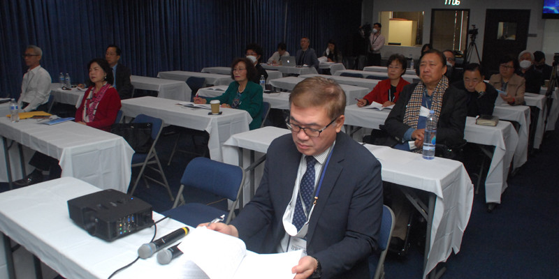 지난 3일 개최된 세계한인기독언론협회 회장 이영선 목사(오른쪽 끝 앞에서 두 번째)와 관계자들이 주제강연을 듣고 있다.