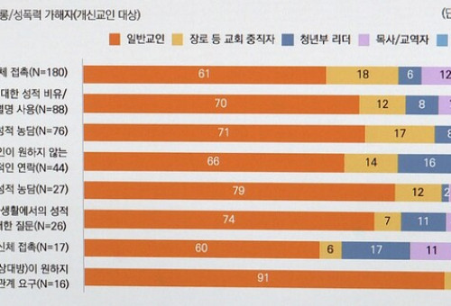 목회자 성범죄 문제는 한국교회의 고질적인 문제로 자리잡고 있다. 목회데이터연구소가 빅데이터로 분석한 한국교회 4대 이슈에서도 ‘목회자 성범죄 문제’가 빠지지 않을 정도다. 그런데 최근 한 보고서에 따르면 교회 내 일반교인의 성범죄 문제도 빈번하게 발생하고 있다는 조사 결과가 나왔다. 최근 조사에서 교회 내 성희롱, 성폭력 가해자로 일반성도의 비중이 상당한 것으로 드러났다. 지금까지 교회 내 목회자 성범죄 문제가 주로 제기돼 왔지만, 일반교인 성범죄 문제도 빈번하게 발생하고 있다는 것이다. 기독교반성폭력센터가 발표한 ‘개신교 성인지 감수성 조사’ 보고서에 따르면 모든 항목에서 절반 이상이 일반교인 성범죄 가해자인 것으로 나타났다.목회데이터연구소 김진양 부대표는 “발생 건수로만 보면 평신도들에게서 발생되는 비율이 굉장히 높게 나타나고 있다”며 “성도들이 목회자보다 다른 성도들과 교제하거나 친교 하는 기회가 훨씬 더 많기 때문에 이런 문제가 발생되는 것 같다”고 분석했다. 그러면서 “앞으로 목회자의 성범죄 문제뿐만 아니라 평신도들의 성범죄의 문제에도 교회가 좀 주목을 해야 된다 이렇게 볼 수 있겠다”고 덧붙였다.특히 이러한 교회 내 성희롱 성폭력 예방을 위해선 예방교육의 필요성이 대두됐다. 개신교인 65%가 출석교회 내 예방교육이 필요하다고 응답했으며, 목회자는 90% 이상이 목회자와 교인을 대상으로 한 예방교육이 필요하다고 답했다. 또 목회자들 대부분은 한국교회에 성범죄 대응 시스템 부재에 동의하고 있어 이에 따른 대책 마련이 필요하다는 지적도 이어졌다. 목회데이터연구소는 “교회 내 성폭력은 남성 목회자의 우월적 지위에 영향을 받을 수밖에 없다”며 교회 구조적 요인에 대한 정확한 인식과 성폭력 발생 환경을 개선하기 위한 노력이 수반되어야 할 것을 강조했다. 김진양 부대표는 “일반 기업에서는 해마다 직원들에게 의무적으로 교육을 시키도록 성희롱과 관련된 예방 교육을 시키도록 하는 것과 같이 교회가 본받아야 될 필요성이 있다”면서 “교회 내 목사와 평신도의 권력 관계가 지금처럼 목사에게 과도한 권력이 집중되는 게 아니라 좀 더 평준적이고 동등한 관계를 맺는 것이 매우 중요하다 생각된다”고 밝혔다. 최근 기독교반성폭력센터가 발표한 ‘개신교 성인지 감수성 조사’ 보고서에 따르면 교회 내 성희롱, 성폭력 가해자로 일반성도의 비중이 상당한 것으로 드러났다.데일리굿뉴스(사장 김명전, www.goodnews1.com)와의 협약을 통해 한국 기독교 소식을 제공합니다.