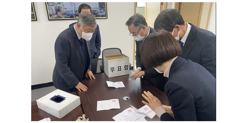고신대학교 총장선출이 3번째 실패로 끝났다. 3월 3일 학교법인 고려학원이사회의 3차 고신대 총장선출 선거에서 이사진들이 개표를 하고 있는 모습.