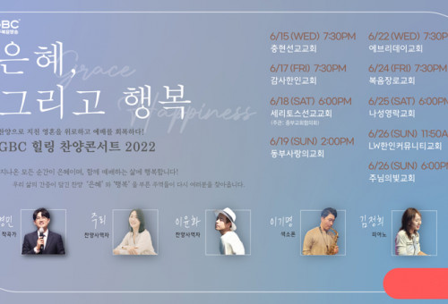 GBC힐링찬양콘서트 포스터.미주복음방송(GBC, 사장 이영선 목사)이 팬데믹과 함께 경제적인 어려움을 지나고 있는 한인 기독교인들을 위로하기 위한 찬양콘서트를 진행한다.GBC 지난 15일을 시작으로 26일까지 약 2주 동안 LA지역을 비롯해 오렌지카운티 지역 9개 한인 교회를 돌며 GBC힐링찬양콘서트를 개최하고 있다. 이번 찬양콘서트는 코로나19로 인한 팬데믹 기간 대면예배가 어려운 상황에 영적으로 지친 기독교인들에게 영성과 새로운 희망을 불러일으키기 위해 마련됐다. 특히 대면예배의 회복이 어렵다는 데이터들이 발표되는 가운데 찬양을 통해 모임의 필요성을 인식 시키기다는 계획이다.이번 GBC힐링찬양콘서트는 지난해 큰 은혜를 끼쳤던 찬양곡, ‘은혜’와 ‘행복’을 작사, 작곡한 손경민 목사와 ‘천번을 불러도’로 널리 알려진 찬양 사역자 주리를 비롯해 윤화, 이기명, 김정희 등의 영성과 실력을 갖춘 정상급 찬양 사역자들이 참여한다.GBC는 “찬양과 예배를 사모하는 모든 그리스도인들이 모여 하나님의 은혜를 기억하고 함께 찬양하며 치유와 회복을 경험하기 위해 마련된 만큼 모든 공연은 무료다”라고 밝혔다.한편 이번 GBC힐링찬양콘서트는 지난 15일 충현선교교회(담임목사 민종기)에서 시작돼 17일 감사한인교회(담임목사 구봉주)와 18일 중부교회협의회 주관으로 세리토스선교교회(담임목사 방상용), 19일 동부사랑의교회(담임목사 우영화) 등에서 진행됐다.오는 22일에는 에브리데이교회 (담임목사 최홍주, 17037 Devonshire St, Northridge), 24일 복음장로교회(담임목사 이광형, 1751 W La Habra Blvd, La Habra), 25일 나성영락교회(담임목사 박은성, 1721 N Broadway, Los Angeles) 등에서 개최된다. 마지막 날인 26일에는 오전 11시 50분 LW한인커뮤니티교회(담임목사 용장영, 14000 Church Pl, Seal Beach)에서, 오후 6시 주님의빛교회(담임목사 주혁로, 5271 Lincoln Ave, Cypress)에서 두 차례 진행된다.2022 GBC힐링찬양콘서트에 참가하는 작곡가 손경민 목사는 ‘은혜’, ‘행복’, ‘감사’, ‘주의 은혜라’, ‘청년의 기도’ 등 한인 기독교인들이 애창하는 많은 CCM곡을 만들었다. 한국 침례신학대학교 교회음악대학원 전 겸임교수, 대전과학기술대학교 실용음악과 전 겸임교수 등을 역임했다. M.net ‘너의 목소리가 보여’ 시즌 5, 6 음악감독 및 편곡가로도 활동한 바 있으며 TV조선 미스트롯 시즌 1 음악편곡 및 음악조감독 등 다수의 음악방송의 책임자로 활동했다.찬양사역자 주리는 ‘나의 예수님’, ‘갚을 수 없는 사랑’, ‘천 번을 불러도’, ‘부르심’, ‘치유의 노래’, ‘사랑이 사라진 이곳에’ 등으로 유명한 찬양 가수다. 2008년 솔로 앨범 ‘갚을 수 없는 사랑’ 으로 데뷔해 2013년 정규앨범 3집을 발행했다. 찬양사역자 이윤화는 지난 2000년 MBC 강변가요제에서 동상을 수상하면서 음악활동을 시작했다. 이후 MBC 시트콤 뉴 논스톱 ost를 제작했으며 그룹 신화 8집 앨범 제작에 참여했다. 대표적인 찬양곡으로 ‘내려놓음’, ‘이땅은’, ‘은혜’ 등이 있다.섹소폰 연주자 이기명 전도사는 바이브, 휘성, 박지헌(V.O.S)등 세션 연주자로 참가했다. 커피소년, 미남오빠 등 다수의 앨범에서 세션작업을 했다. 이기명 1집 ‘I Surrender All’ 발간했다.피아노 연주자인 김정희 사모는 ‘은혜’, ‘행복’, ‘감사’ 등 다수의 찬양곡에서 피아노를 연주했다. 대전과학기술대학교 실용음악과 외부강사로 활동했다. TV조선 ‘미스트롯’ 건반편곡 및 다수의 방송음악 세션 연주자로 활동했으며 솔로음반 1집 ‘평안의 기도’를 발매했다.